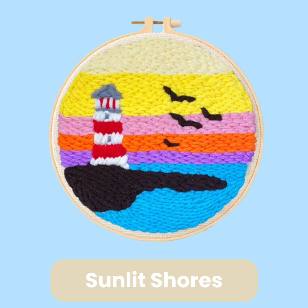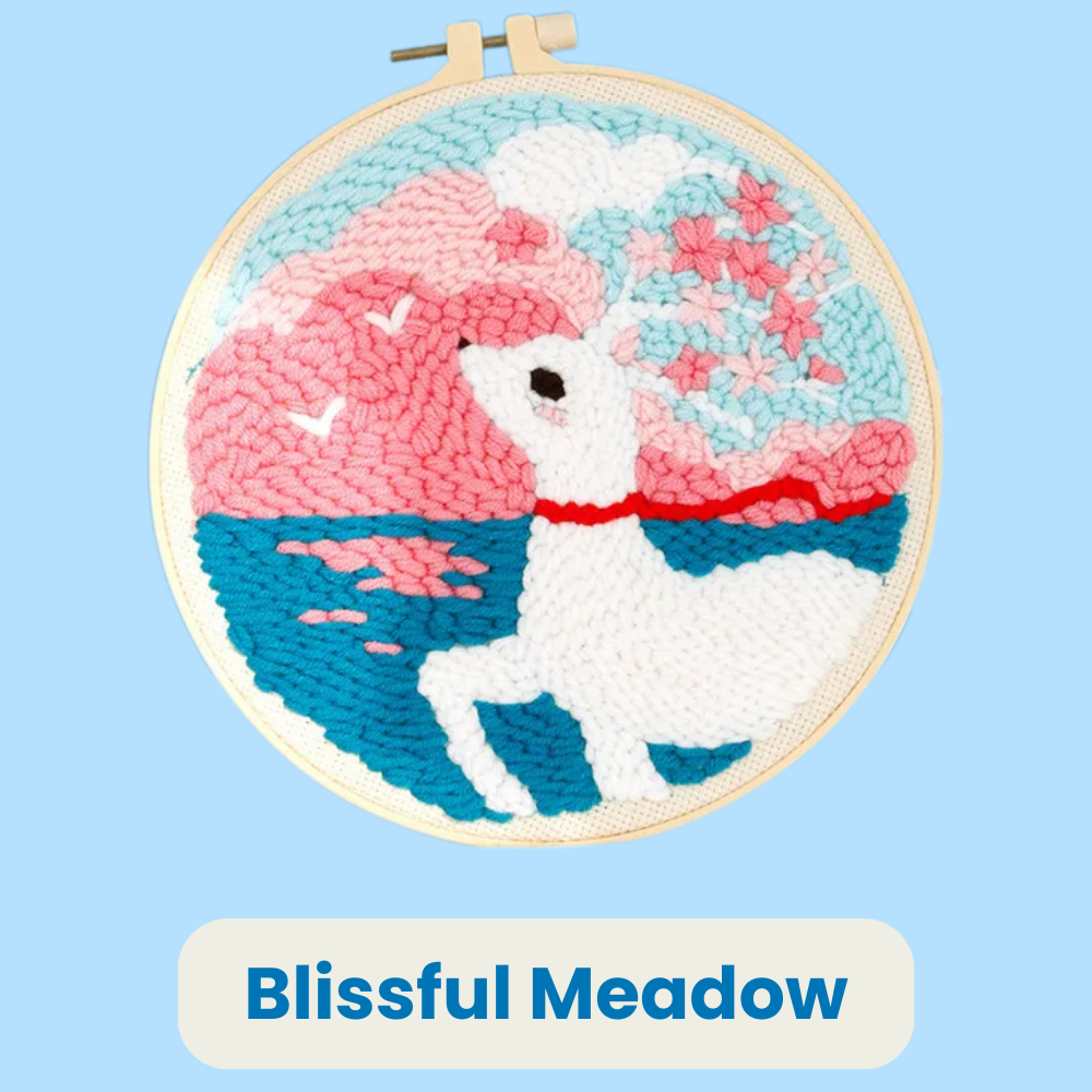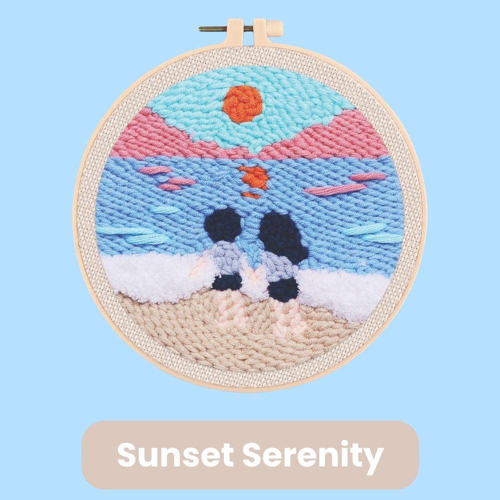Each kit includes a pre-printed fabric, an adjustable punch needle, embroidery thread, a hoop, and step-by-step instructions.